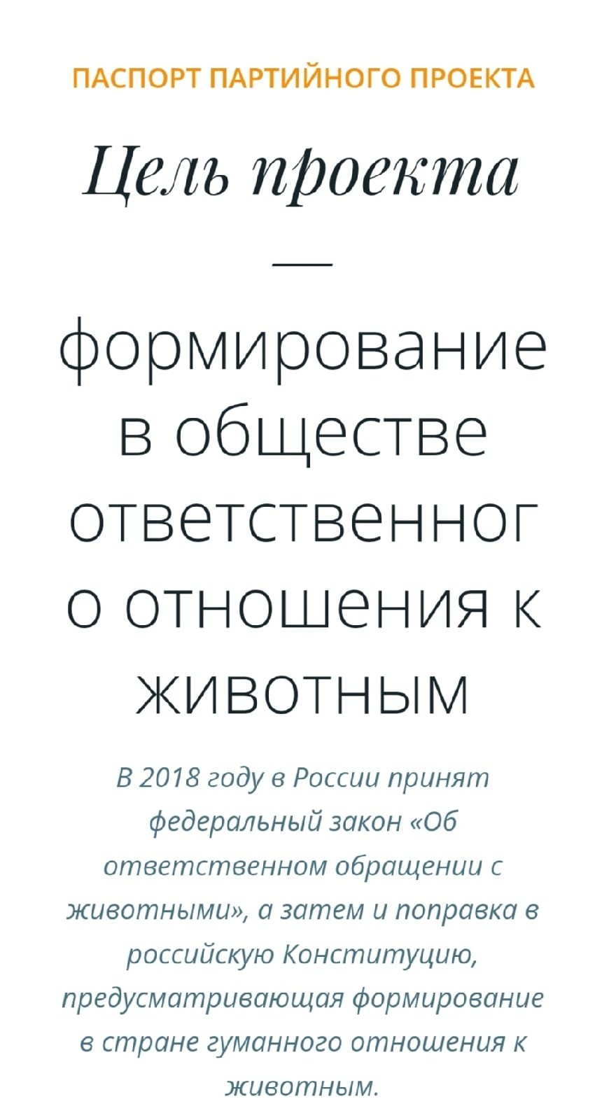 Чтобы изменить эту ситуацию, Всероссийская партия «Единая Россия» инициировала Федеральный партийный проект «Защита животного мира». Его главная цель – воспитать в обществе глубокое и ответственное отношение к братьям нашим меньшим. Важным шагом стало принятие в 2018 году федерального закона «Об ответственном обращении с животными», а затем и конституционной поправки, закрепляющей гуманное отношение к животным как норму.