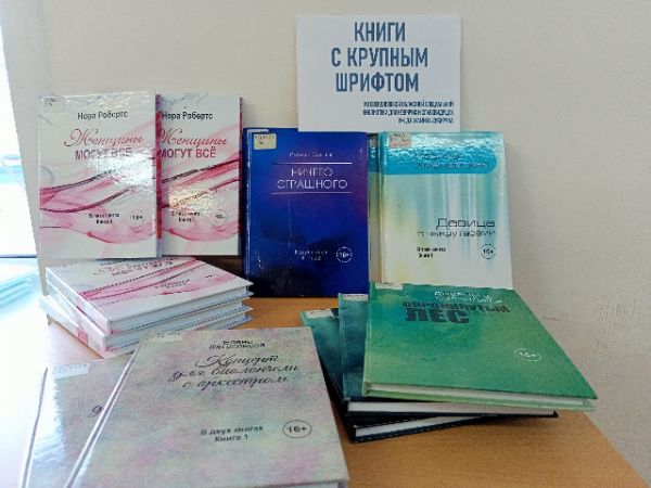 Такие книги во временное пользование Городской библиотеке предоставлены Свердловской областной специальной библиотекой для незрячих и слабовидящих им. Д.Н. Мамина-Сибиряка.