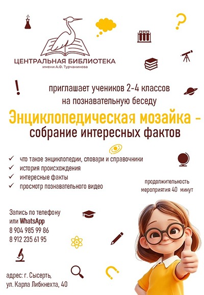 В Центральной библиотеке им. А. Турчанинова для юных читателей проходят познавательные часы «Энциклопедическая мозаика», посвящённые миру справочной литературы. Ребята узнали, чем отличаются энциклопедии от словарей и справочников, и познакомились с историей создания знаменитого словаря Владимира Даля. Интерактивная программа включала «Колесо фортуны» с научными фактами и игру «Правда или ложь», проверявшую логику и интуицию. Особый восторг вызвал «Лототрон» с карточками о необычных историях из жизни великих людей. Такие встречи в игровой форме прививают интерес к познанию и учат работать с информацией.